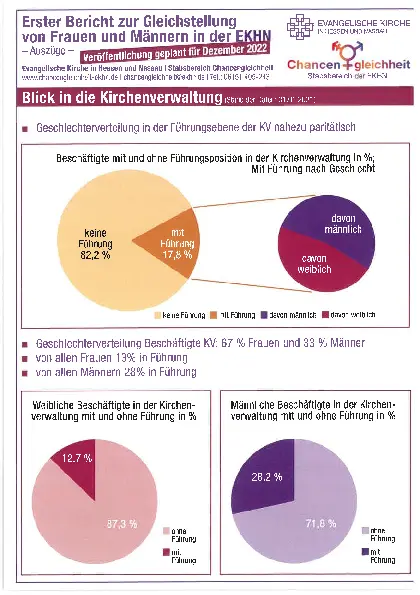 Seit 2014 erfolgt innerhalb der EKD ein kontinuierliches Gleichstellungs-Monitoring. Es liefert Zahlen und Fakten darüber, wie sich Geschlechtergerechtigkeit im kirchlichen Leben entwickelt (hat). Auf den ersten „Atlas zur Gleichstellung von Frauen und Männern in der evangelischen Kirche in Deutschland“ folgten die beiden historisch ausgerichteten Ergänzungsbände „Gleichstellung im geistlichen Amt“ (2017) und „Frauenwahlrecht in der Kirche“ (2019). 2020 erschien die Zwischenauswertung „Wer leitet die Kirche?“. Weitere Meilensteine, etwa zu Gleichstellungsfragen rund um sexuelle und geschlechtliche Vielfalt, sind in Planung.